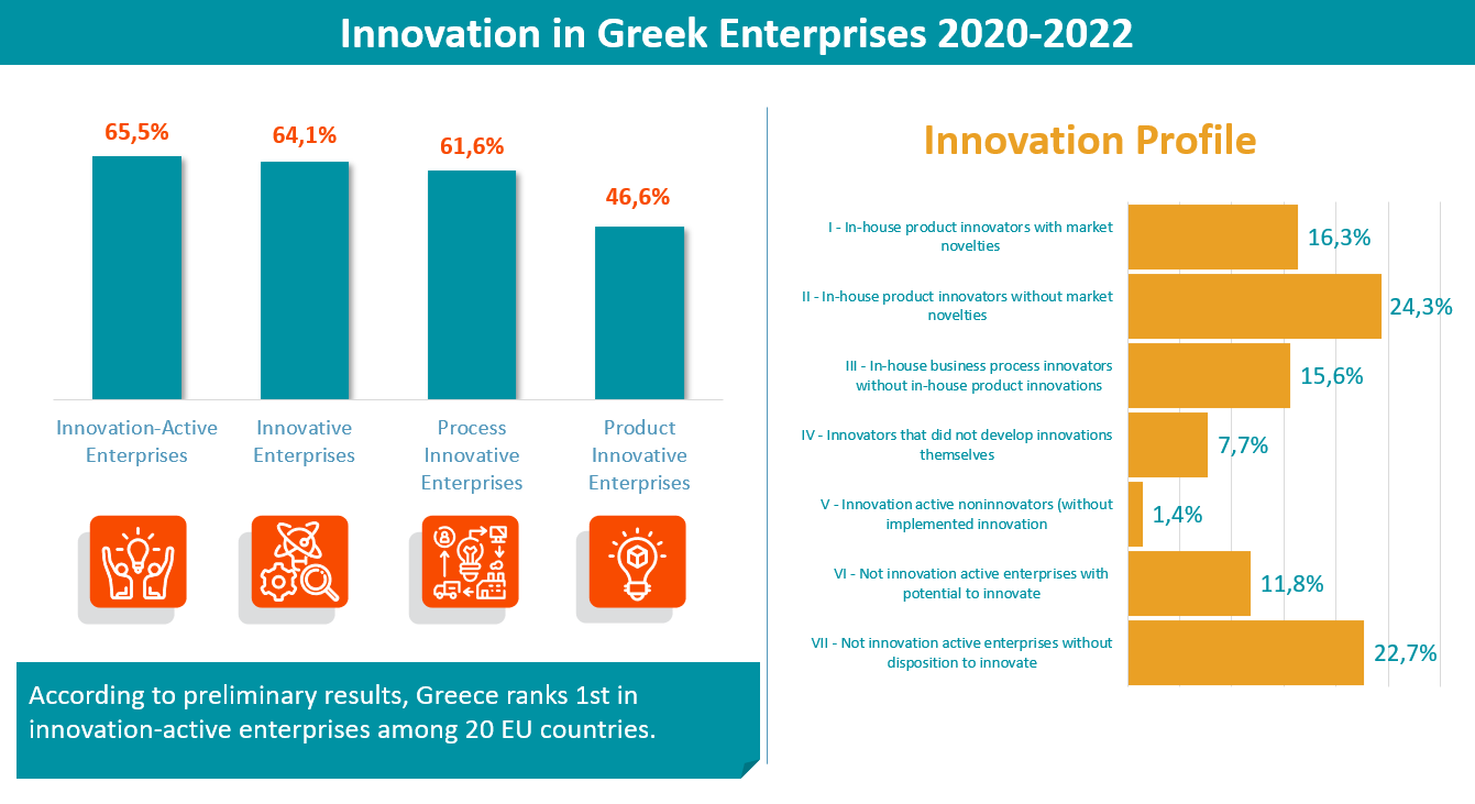 Analyzing how Greek businesses innovate, the types of innovations they introduce, as well as the reasons why they do not innovate, Eurostat, with the contribution of the National Documentation Centre (EKT), developed a new classification system that organizes businesses into seven innovation profiles, with the top category (at 24.3%) being innovative enterprises that internally develop product innovations without novelties.