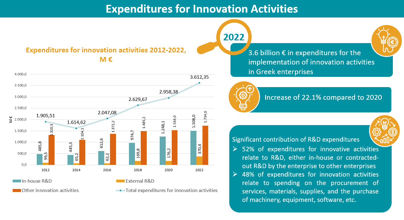 The total expenditure for innovation activities in 2022 amounted to 3.6 billion €, an increase of 22.1% compared to 2020, continuing the upward trend since 2014. This expenditure is divided as follows: 52% of expenditures relate for R&D activities, either in-house R&D or contracted-out R&D by the enterprise to other enterprises (external R&D) and 48% relate to other innovation activities.