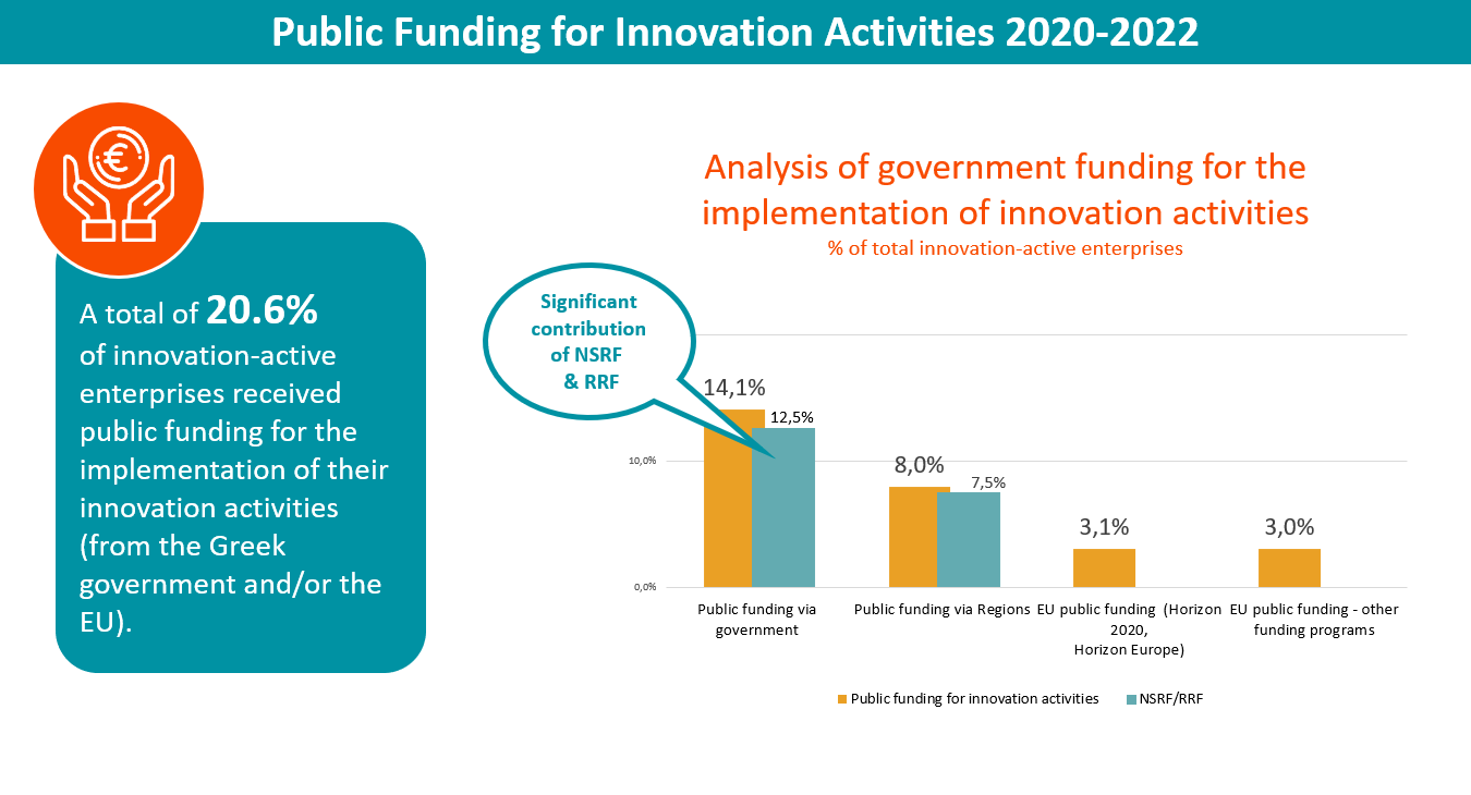 A total of 20.6% of innovation-active enterprises received public funding for their innovation activities. Specifically, 14.1% received funding from the Central Government (12.5% through the NSRF or RRF), 8% from regional authorities (7.5% through the NSRF), 3.1% via the European programs "Horizon 2020" and "Horizon Europe," and 3% via other European programs.