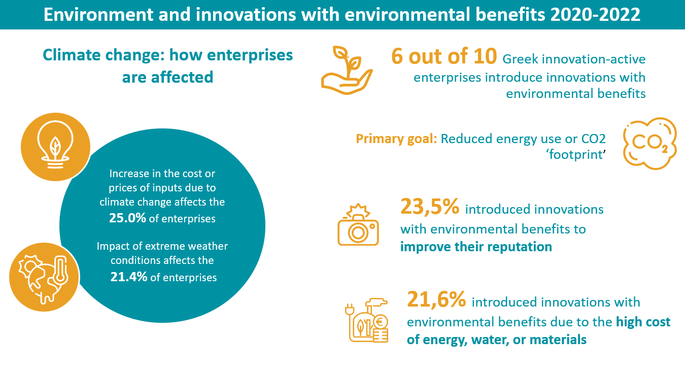 A total of 25% of enterprises believe that their operations are directly affected by rising costs resulting from climate change, while 21.4% consider the impacts of extreme weather conditions to be very significant. Among innovation-active enterprises, 60.7% report that they have introduced some innovation with environmental benefits, setting as the primary goal the reduction of energy consumption and carbon dioxide (CO2) emissions.