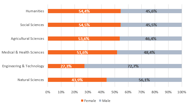 Based on the statistics of PhDs awarded by a Greek university in 2022, women outnumber men in four out of six scientific fields: Social Sciences (54.5%), Humanities (54.4%), Agricultural Sciences (53.6%), Medical & Health Sciences (51.6%).