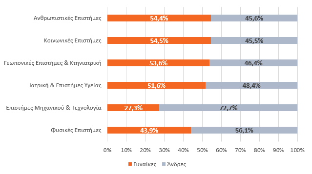 Με βάση τα στατιστικά στοιχεία των διδακτόρων στους οποίους απονεμήθηκε διδακτορικός τίτλος από ελληνικό πανεπιστήμιο το 2022, οι γυναίκες υπερτερούν των ανδρών σε τέσσερα από τα έξι επιστημονικά πεδία: Κοινωνικές Επιστήμες (54,5%), Ανθρωπιστικές Επιστήμες & Τέχνες (54,4%), Γεωπονικές Επιστήμες & Κτηνιατρική (53,6%), Ιατρική & Επιστήμες Υγείας (51,6%).